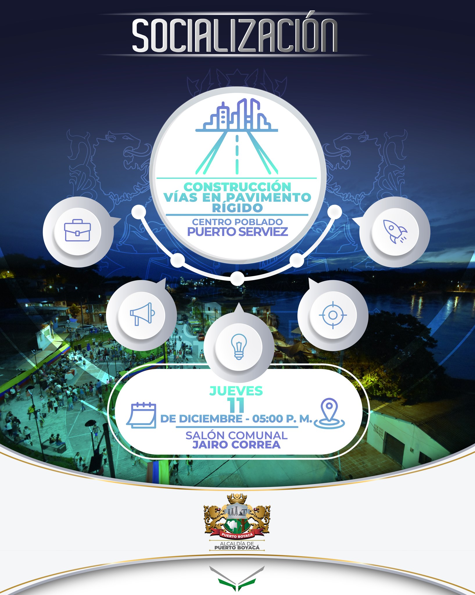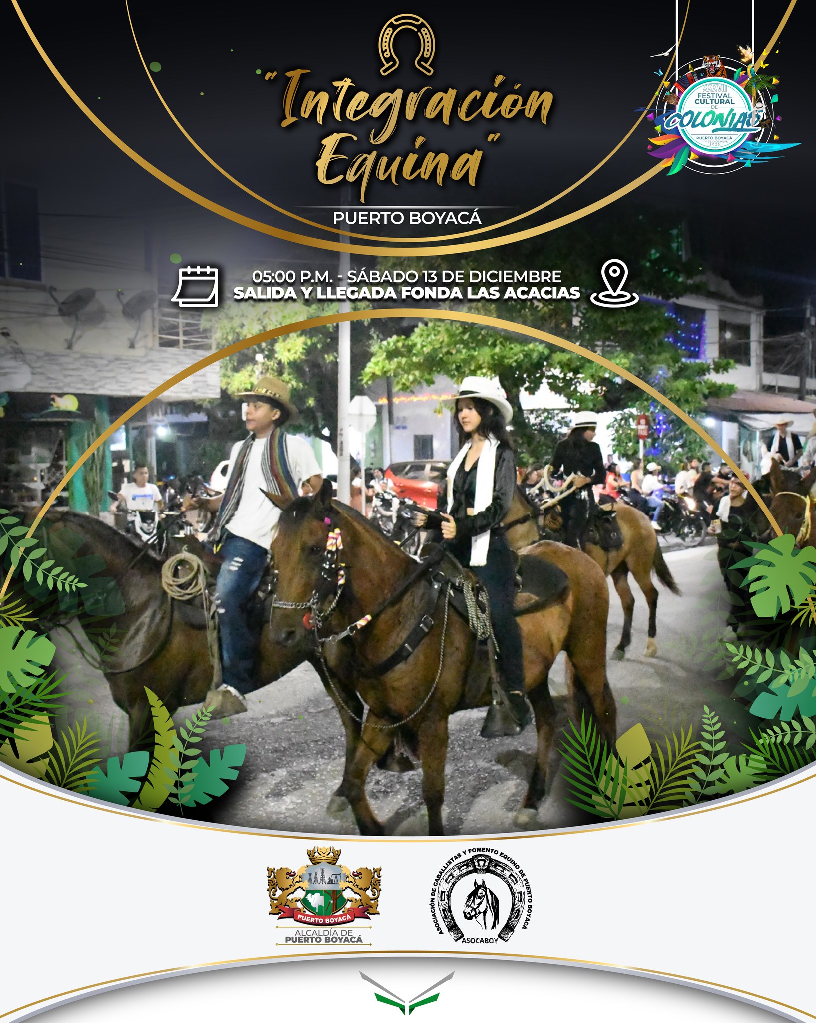 FELIZ CUMPLEAÑOS 68 PUERTO BOYACÁ14/12/2025Hoy honramos una tierra forjada por el río, el trabajo y el encuentro de muchas culturas. 68 años de esfuerzo, de sueños compartidos y de una comunidad que no se rinde, que avanza unida y que celebra su identidad con alegría. INTEGRACIÓN EQUINA PUERTO BOYACÁ13/12/2025Hoy sábado 13 de diciembre, a partir de las 5:00 p.m., viviremos la Integración Equina, una de las expresiones más representativas de nuestro Festival Cultural de Colonias. SOCIALIZACIÓN CONSTRUCCIÓN VIAS10/12/2025Acompáñanos mañana a la socialización del proyecto de pavimento rígido, una obra que mejorará el tránsito, la seguridad y la conexión de nuestro Centro Poblado.